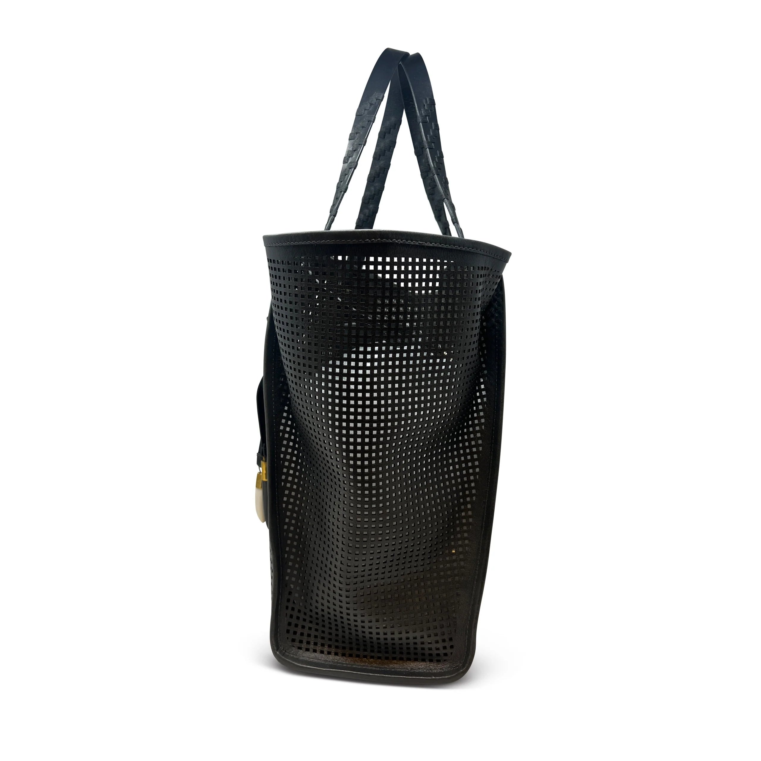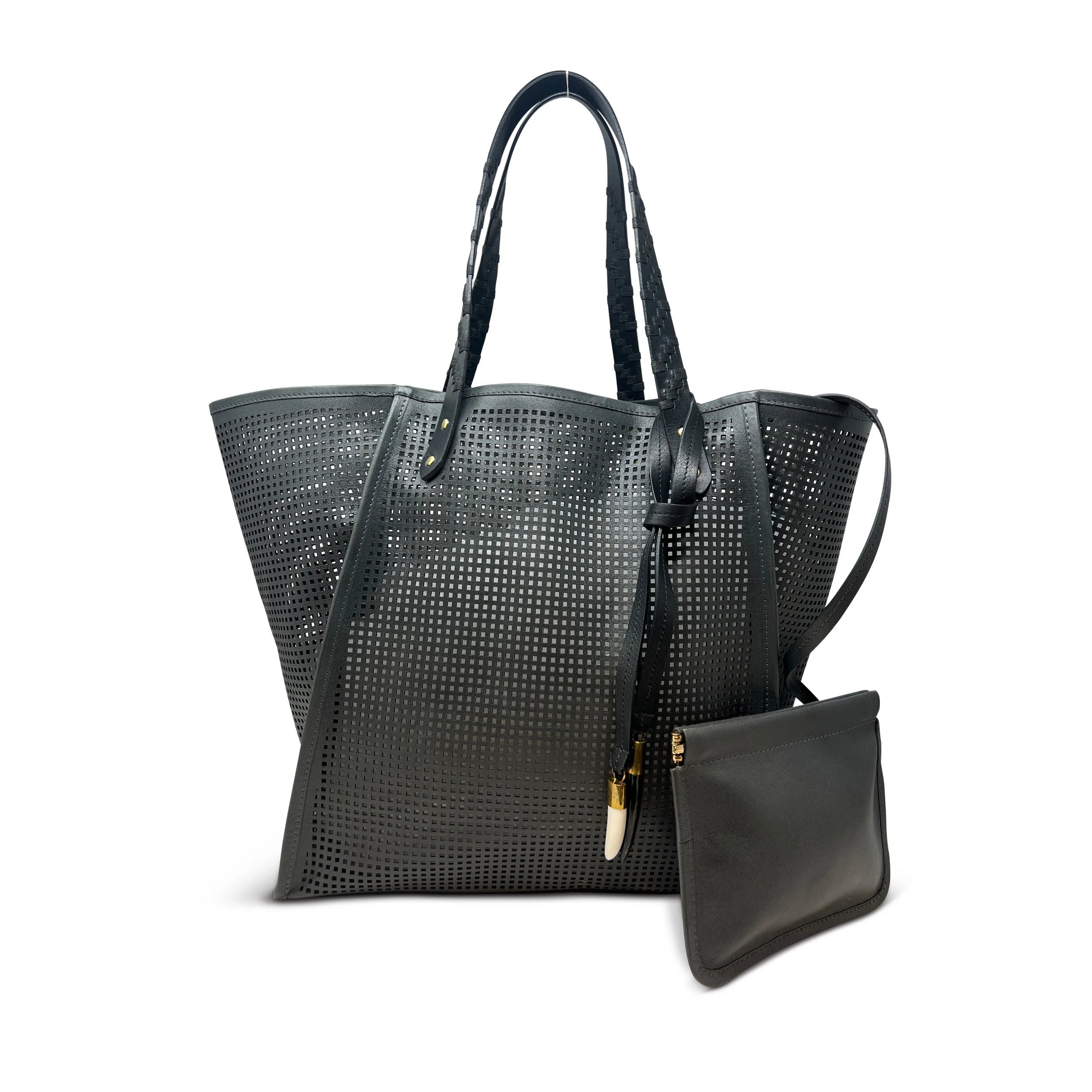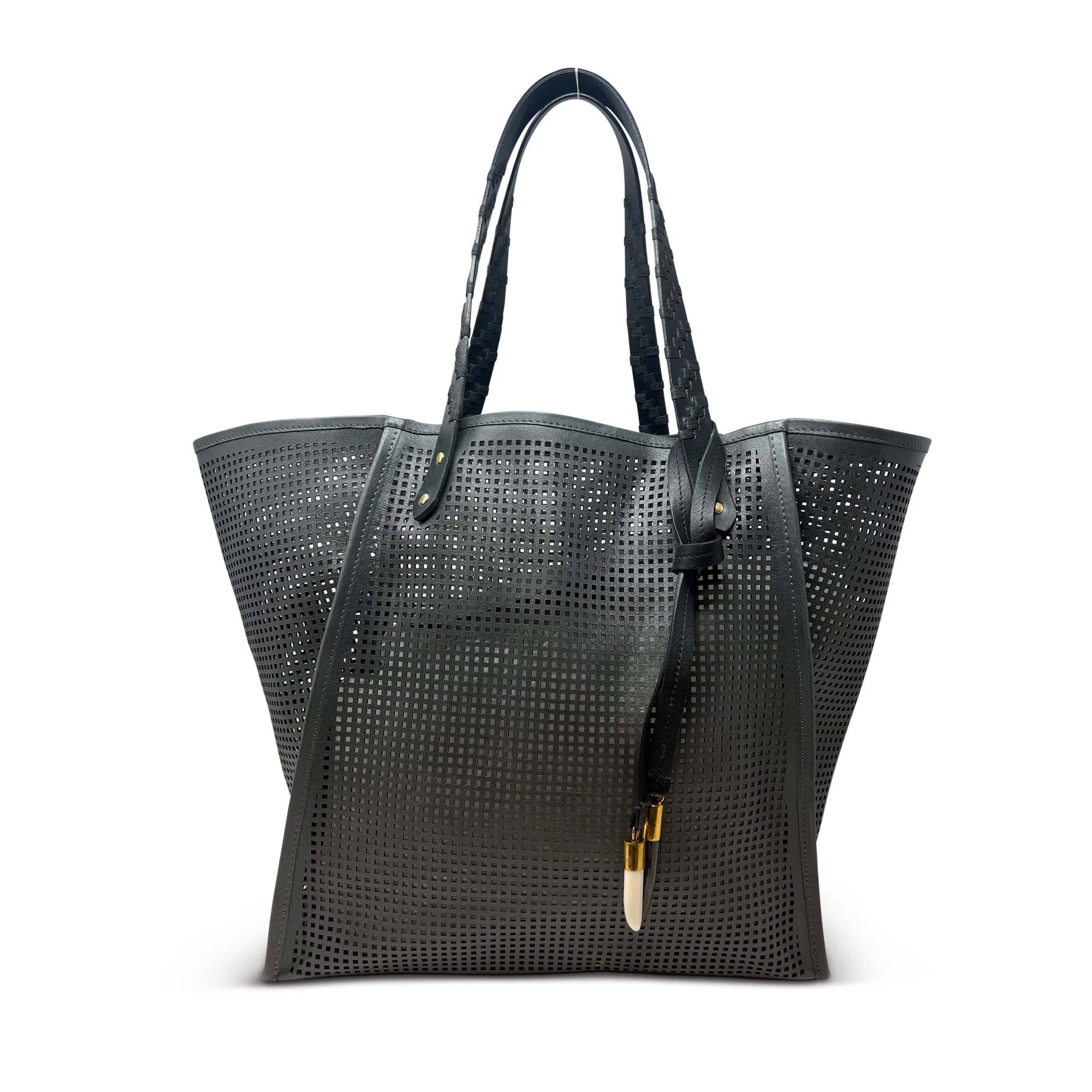 For when you want to go as pared back and slick as it gets look no further. The Taunton Tote is a Tote-m to minimalism. The gunmetal square perforated leather is beautifully weightless and ready to carry you to new horizons and heights. Going to the office, throw in your laptop. Going strolling about town? Wear it crossbody. Neat, structured, and elegant, you'll cut a dapper and refined look that will skyrocket your style in ways you can't imagine. Offset by embroidered wide leather handles and signature toggle, flaunt it carried from your shoulder and let the supple sleek leather in this gorgeous gunmetal catch the winter sun and gleam like a polished Holland and Holland rifle. Who said there's no such thing as the perfect dream bag!