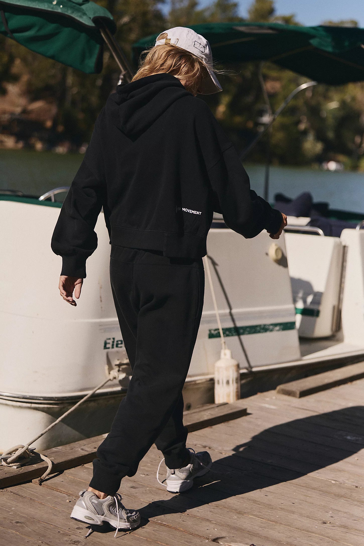 Classic hood; dropped shoulders; elasticated hems; lower back hem; high-rise pants; drawstring waistline; elasticated ankle cuffs
