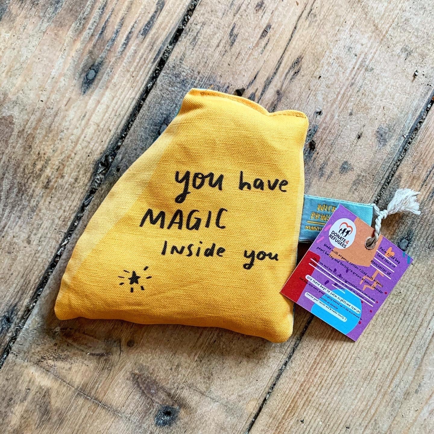 We use these bags to calm nighttime scaries and they also work great slightly heated up in the microwave, to soothe an earache. We have heard customers have bought these for kiddos who are feeling the nerves for school exams, first days of new jobs, and even for those who suffer chilblains - as they can be gently heated in the microwave and kept in a pocket for lovely warm hands.