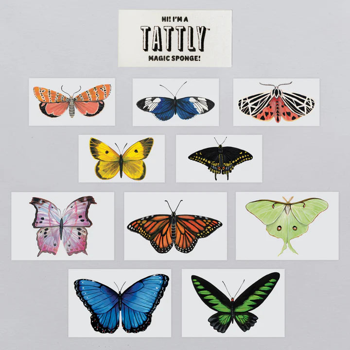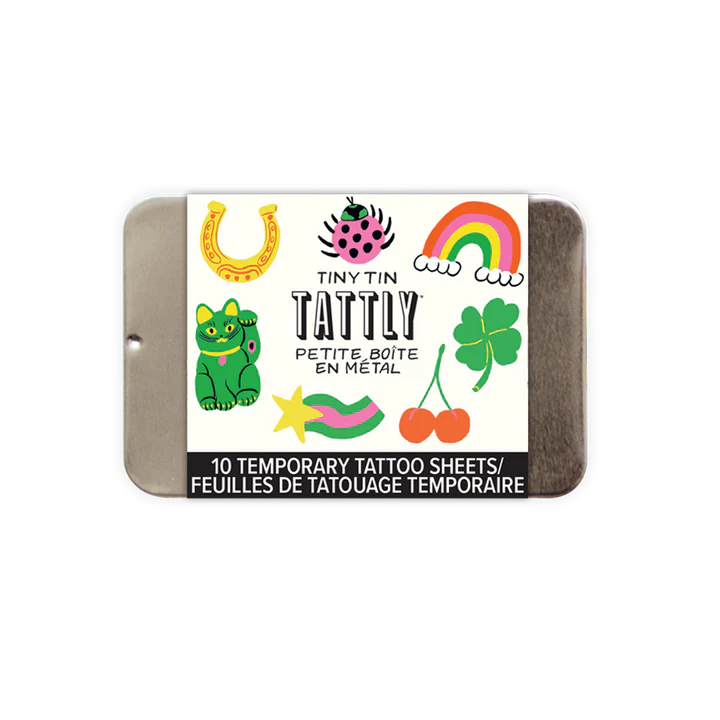 Tattly tattoos are printed with cruelty-free and vegan ink, lasting on average 2-4 days. Each tiny tin contains 10 unique temporary tattoos. We suggest placing on oil-free areas where skin does not stretch and keep them clean! Watch this Application Video to become a pro.