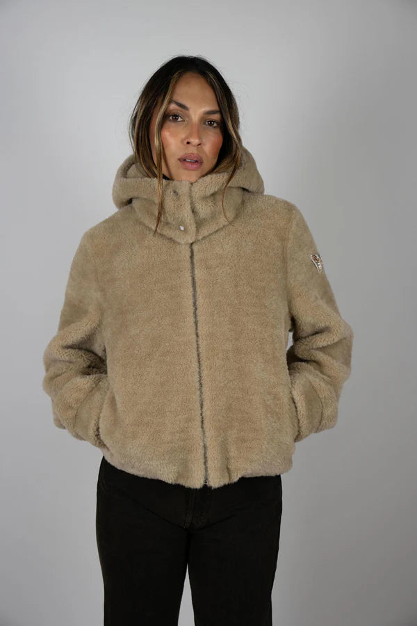 Sporty meets super chic in the Slope Room Beige Fur Bomber — the ultimate après piece reimagined. Crafted in luxuriously soft faux fur, this cropped jacket offers plush comfort with a refined silhouette that’s effortlessly cool.