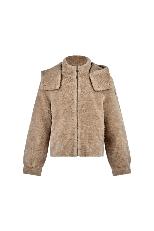 It blends high-performance style with elevated fashion. The structured hood and clean zip front bring function and edge, while the neutral beige tone makes it endlessly versatile — perfect over activewear or dressed up with leather pants and boots.