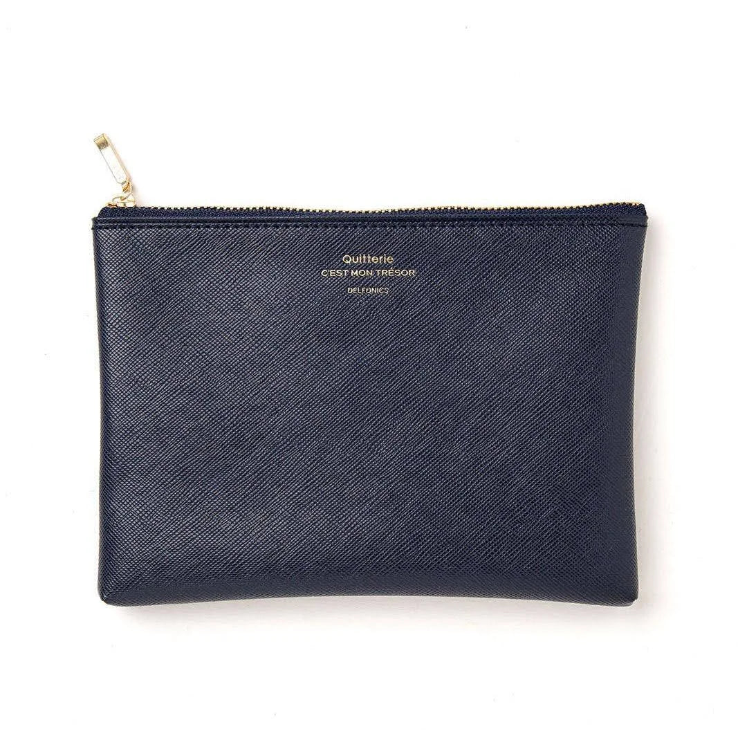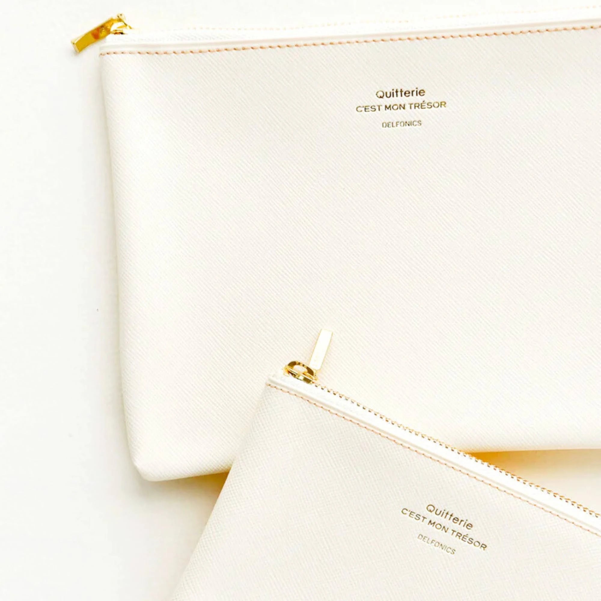 Delfonics Quitterie Pouches are compact pouches made from highly durable, waterproof PVC with a scotch grain texture. Features metallic hardware and foil stamp lettering for a chic look. Perfect for organizing small items that you wouldn't want to lose in a larger bag such as cosmetics, eye drops, credit cards, or even your smartphone. Perfect for students, professors, business professionals, parents on-the-go, and more. Makes a great addition to any luggage or travel bag. Available in various colors and sizes.