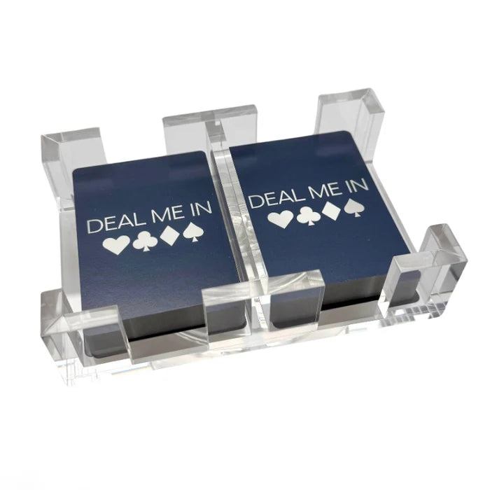 Custom designed and crafted acrylic spinner with 2 decks* of "Deal Me In" cards. This set marries form with function and brings a sense of luxury and style to your card table. The spinner is engineered to offer maximum efficiency for card removal while maintaining the cutting edge style that Lined Design is known for.