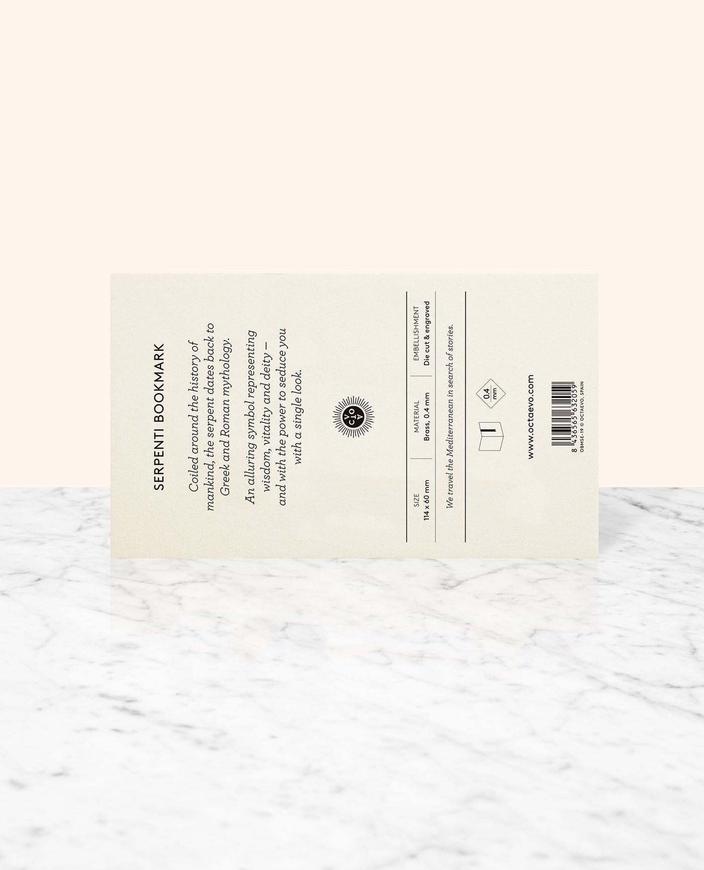 This finely-cut metal bookmark slips onto a page like a silk glove. Finished with a subtle sheen and presented on a screen-printed, post-card sized mount.
