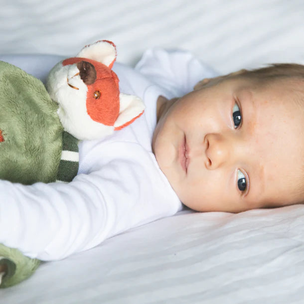 Everyone's favorite fox is a blanket! This blankie comes in earth tones and olive green velvet. Its matching patches and bold colors make this rug unique and will catch your baby’s eye. Feel free to give our Foxy Blankie a tug, he is handmade with quality you can trust for your little one. (Dimensions: 10 x 17 inches)