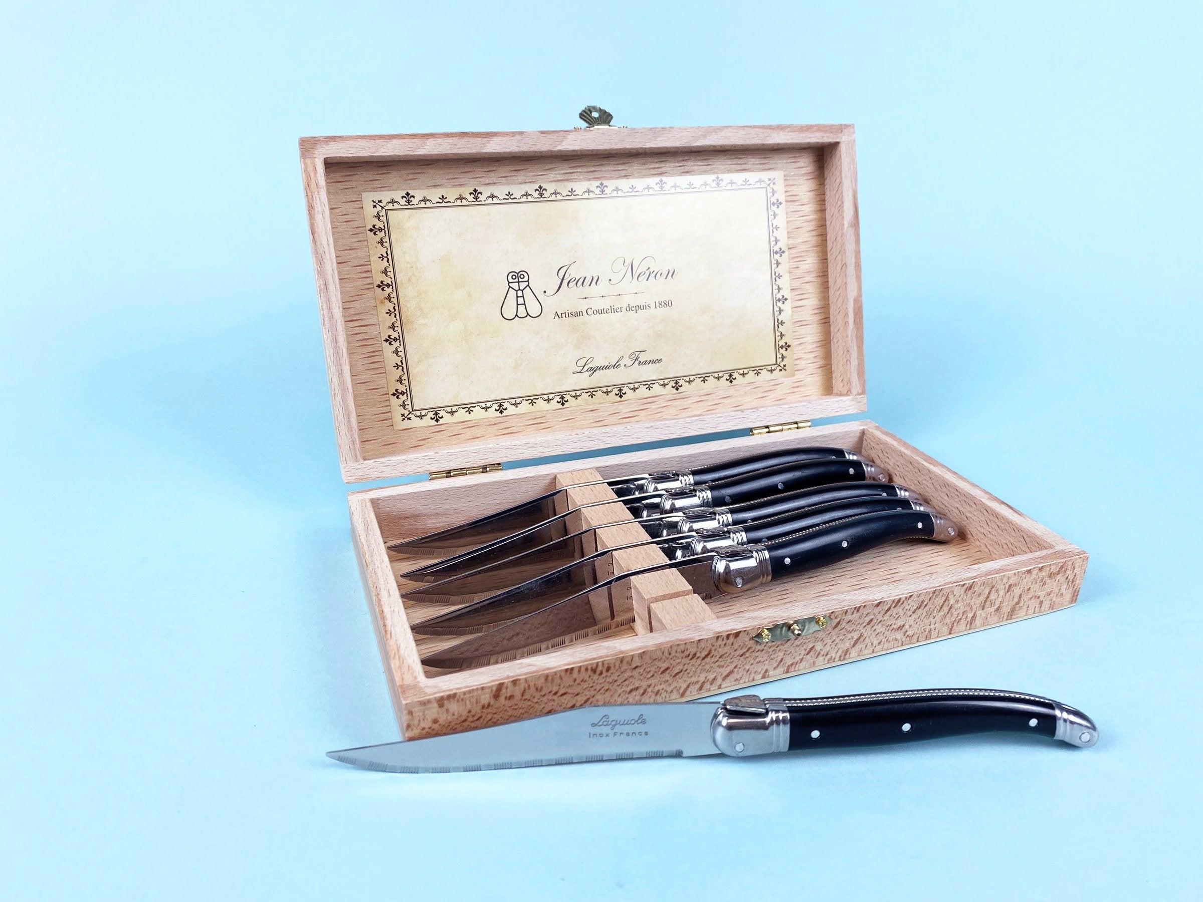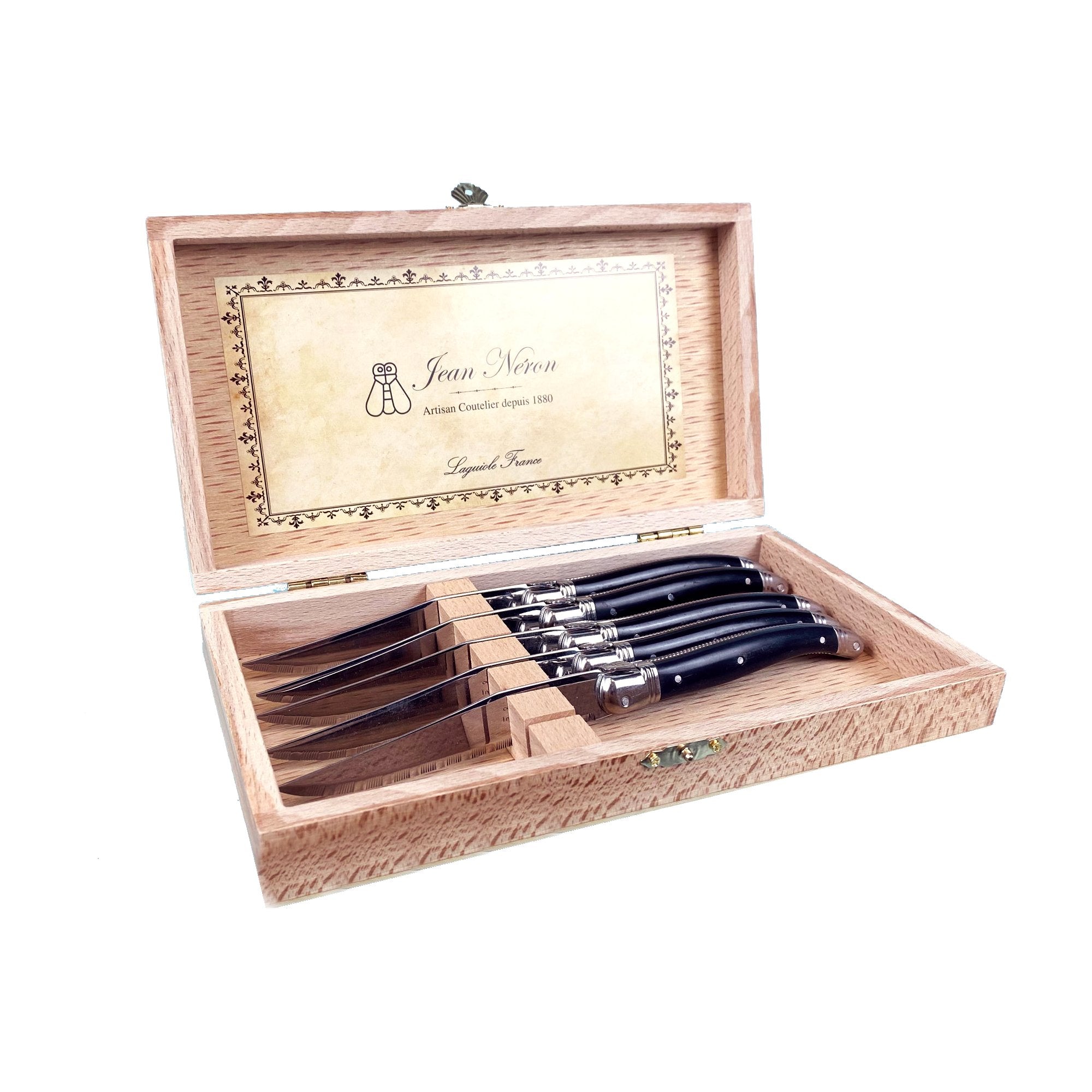 Jean Neron Laguiole Set of 6 Steak Knives in Presentation Box • Black Platine